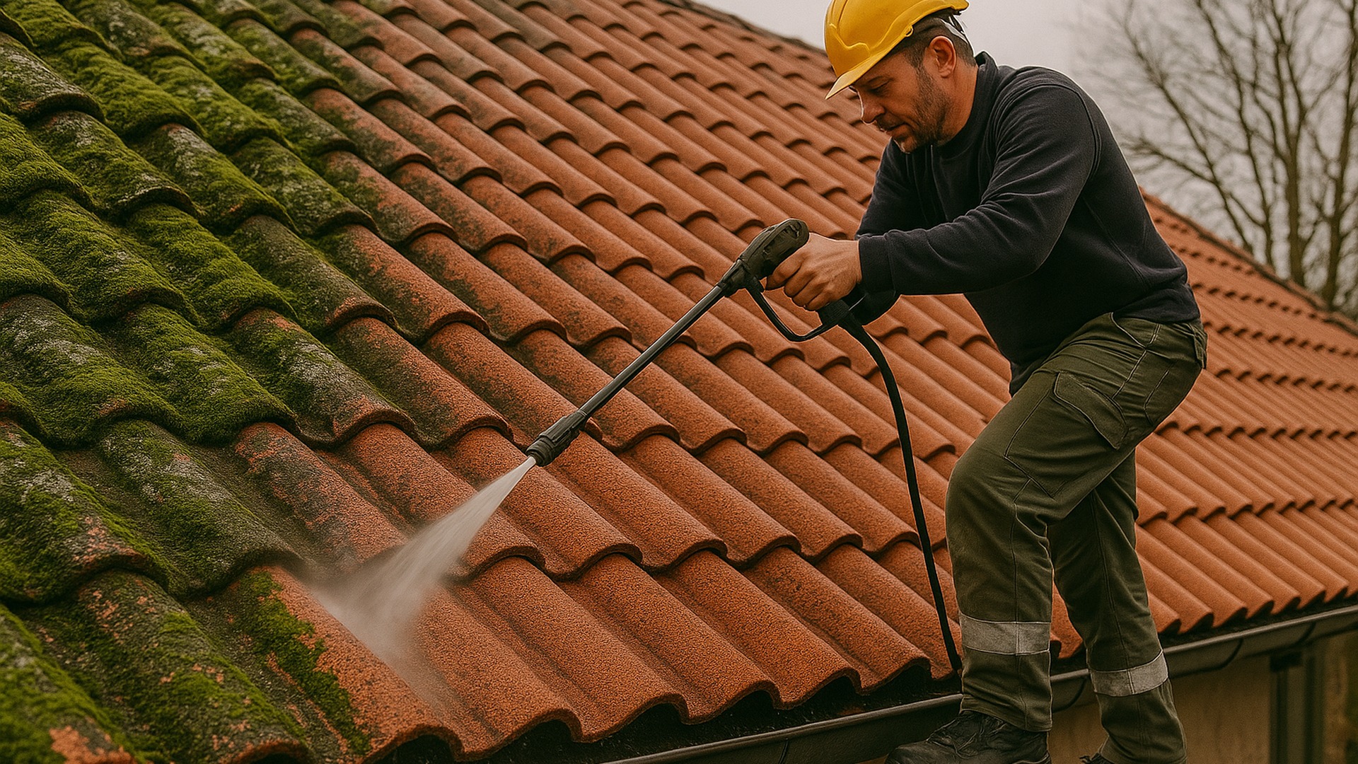 - Retrait de la mousse, du lichen et des débris sans abîmer les tuiles.
